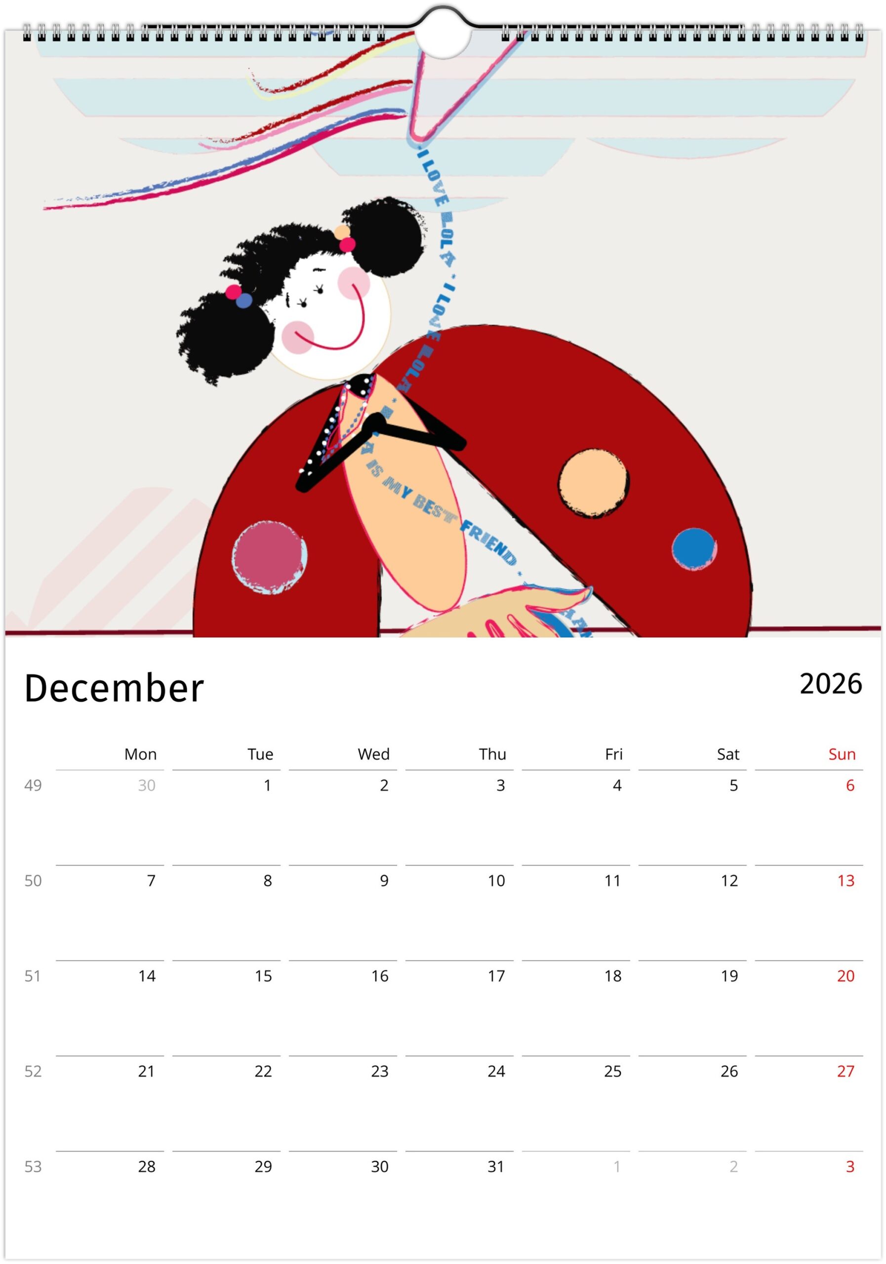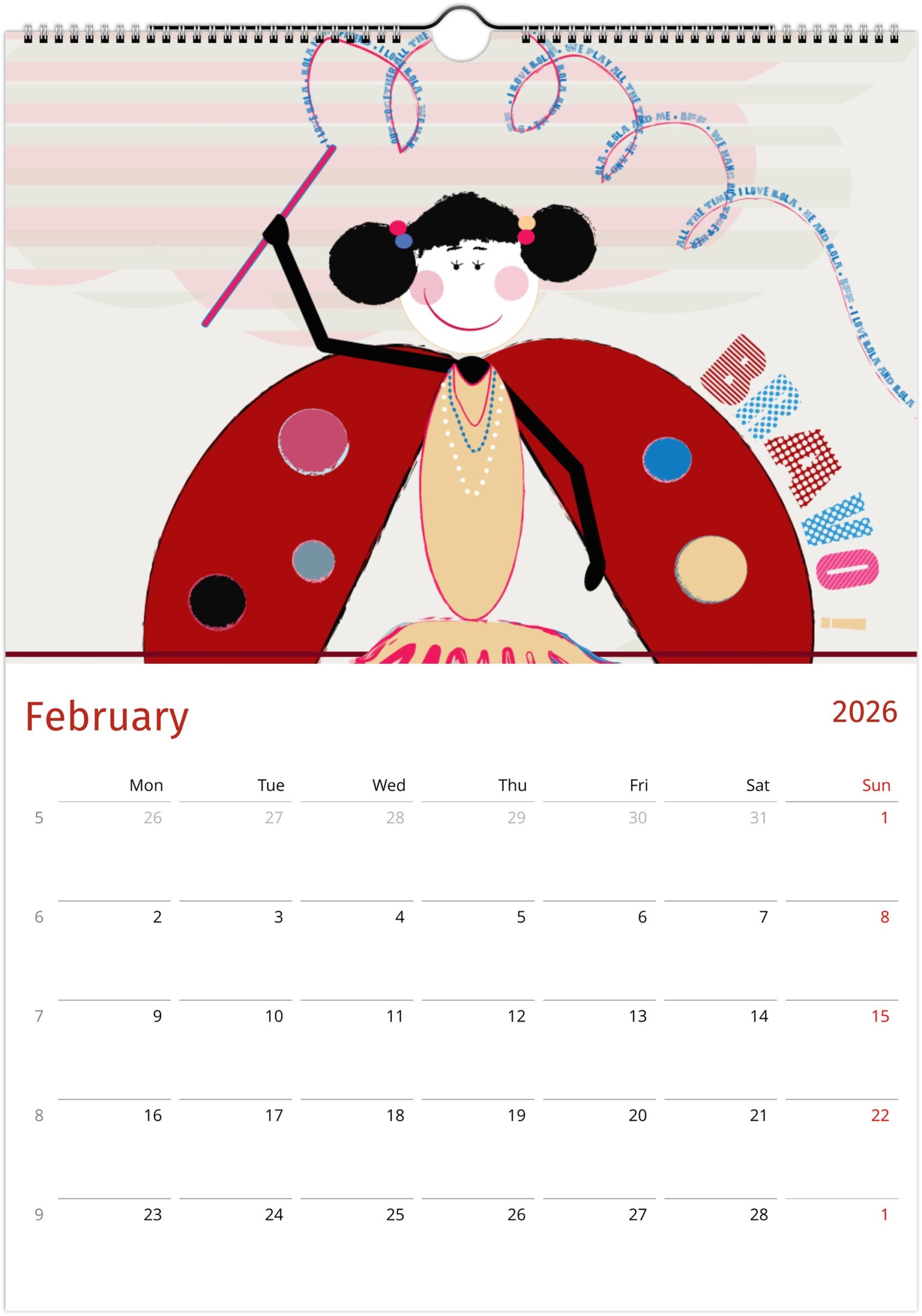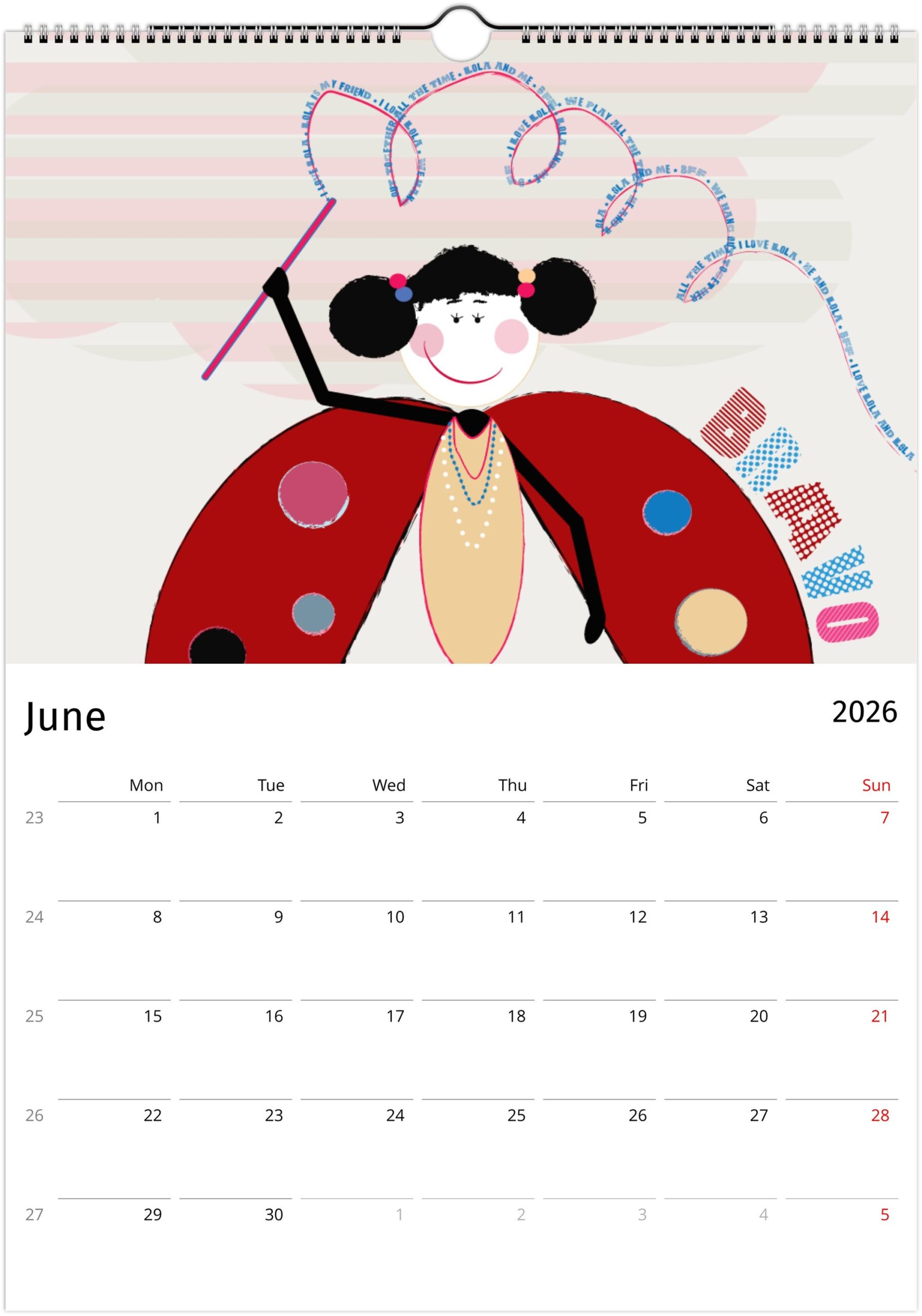 A joyful and original wall calendar inspired by Lola BFF,  colourful, playful, and full of heart. Each month captures Lola in her favourite moments — dancing, flying her kite, or taking a dreamy snooze. Perfect for brightening up kids’ rooms or as a gift to bring a little happiness all year long.
