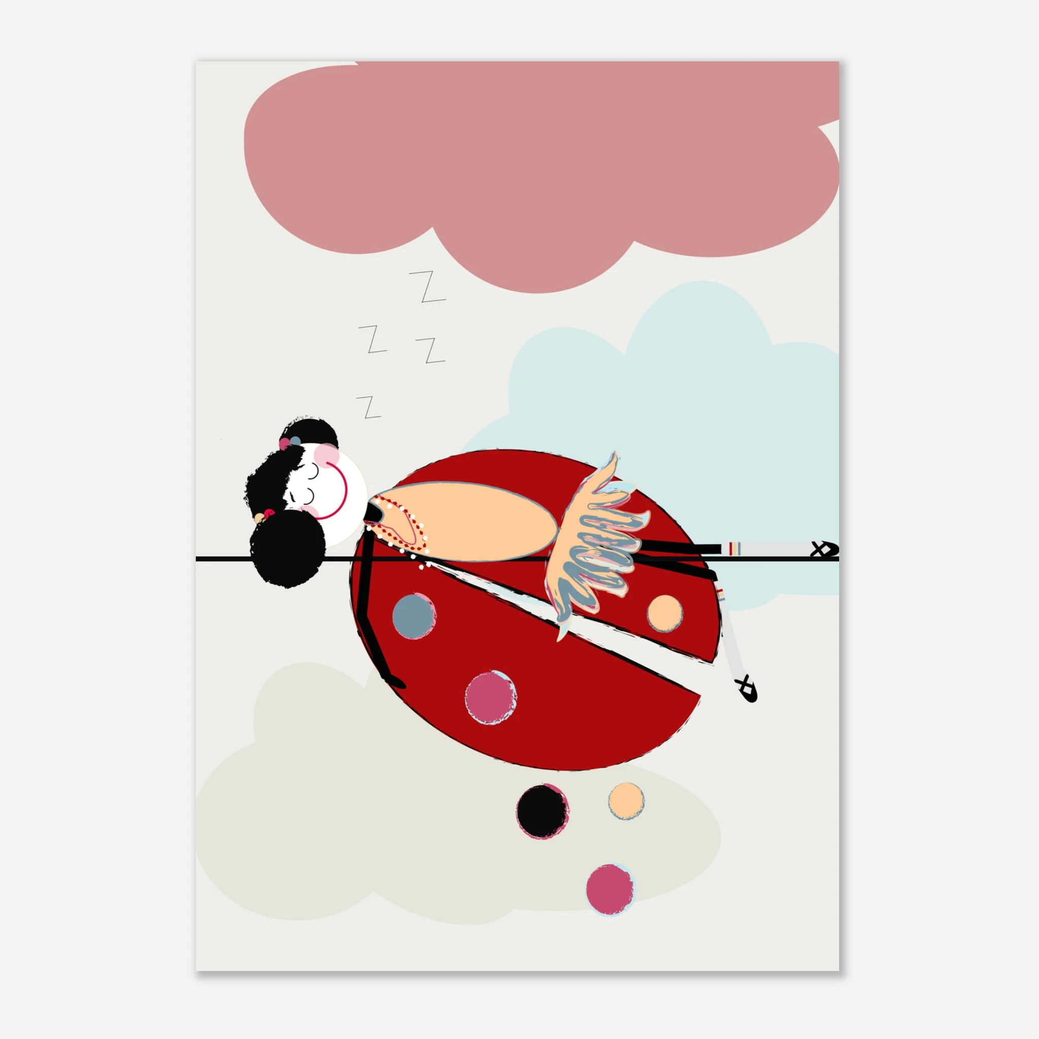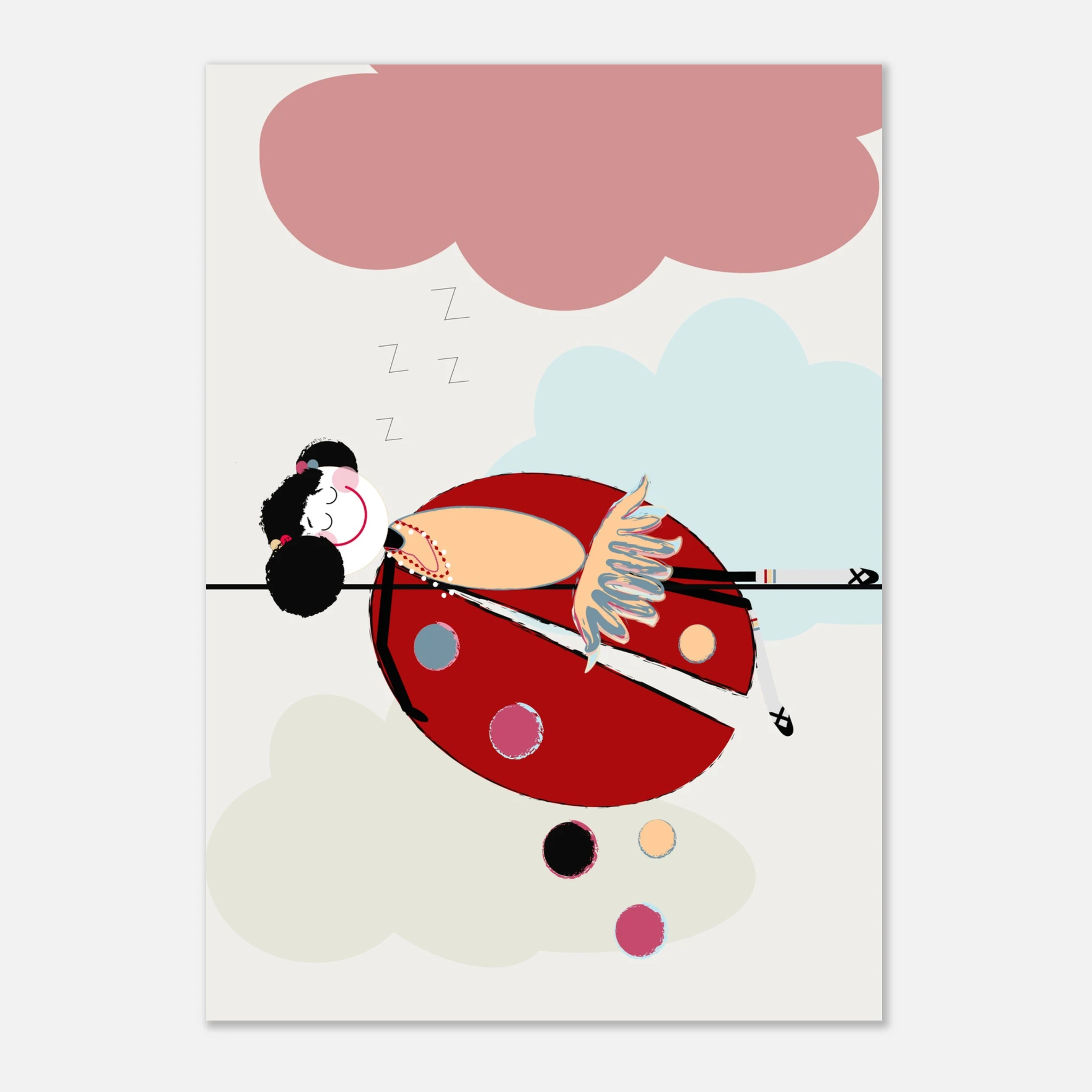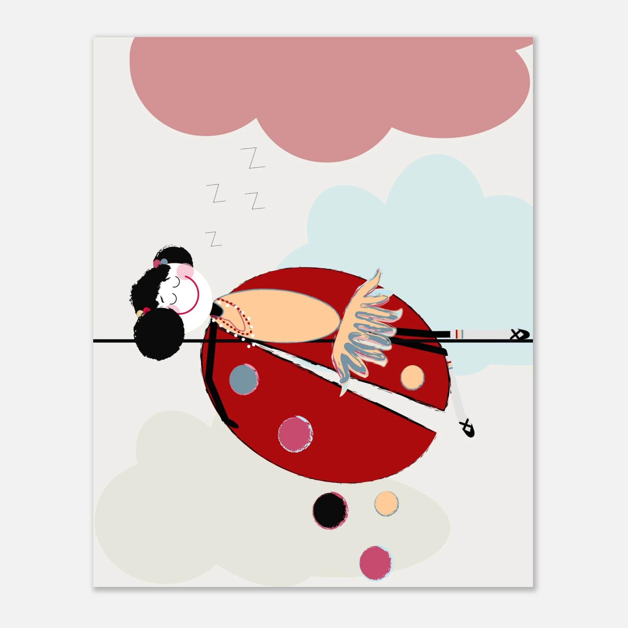 The “Lola Snoozing” poster from The Ladybird Lola Collection is a peaceful addition, tailored for imaginative young girls. Lola, captured in a moment of rest and tranquility, brings a touch of calm and comfort to any girl’s space. This artwork creates a serene and imaginative atmosphere, perfect for moments of relaxation and reflection.